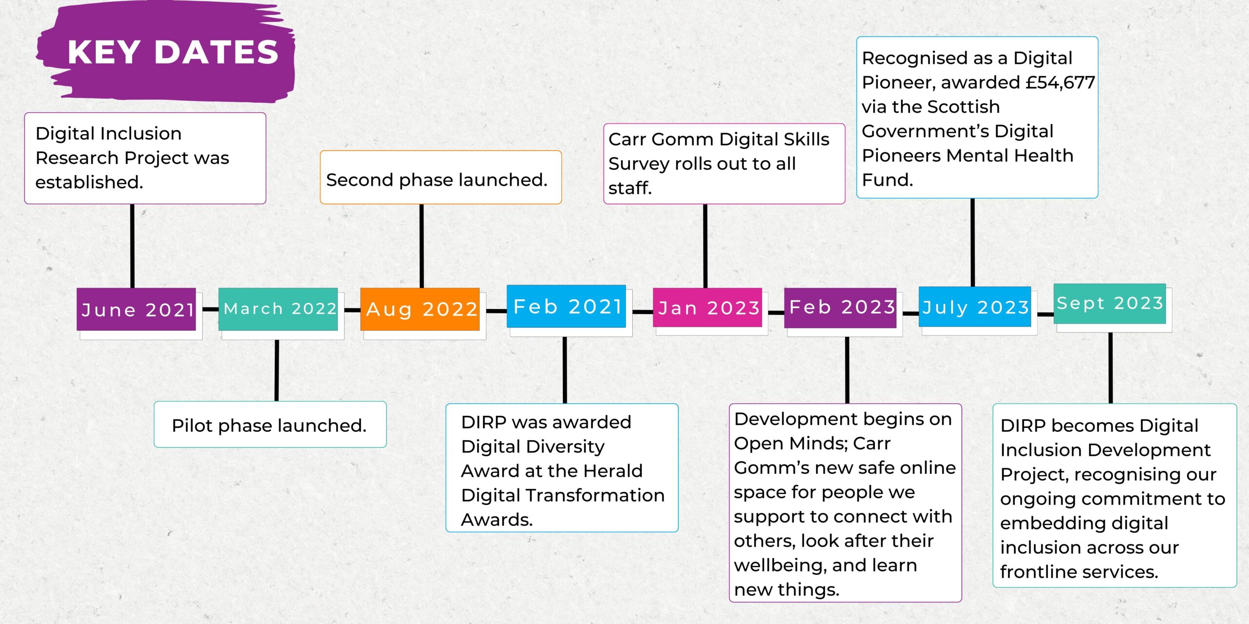 In September 2023, DIRP became the Digital Inclusion Development Project, recognising our ongoing commitment to embedding digital inclusion; appreciating digital choice as a fundamental human right and marker of high-quality social care support.