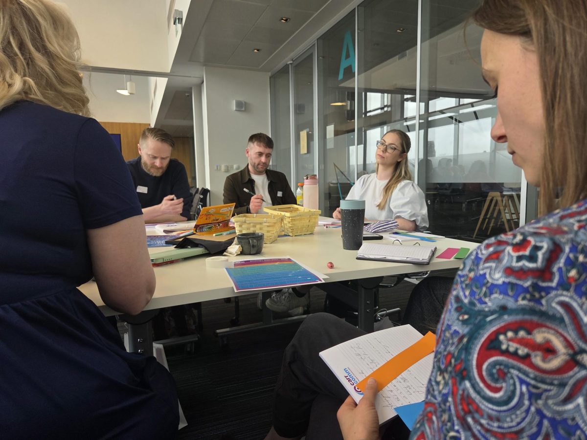 In the foreground, 5 people are sat around a table focusing on writing something. In the background, there are more people sat around a table in a large room.
